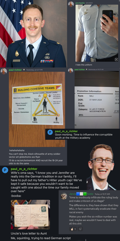 MAJ David Simeroth USAF: David fell down the anti-woke wormhole and came out the other end a White Nationalist and NPA member. He’s currently teaching (and residing) at the West Point US Military Academy in a rather prestigious position teaching aerospace science and the like. Despite being so smart he left enough bread crumbs in the Discord and on Telegram to figure out who he was. He is a COVID truther and anti-vaxxer. He also constantly talks about spreading racism and political extremism amongst his students and those under him and constantly complains that the US Military is controlled by a Jewish conspiracy. He is slated to be tapped for an advisor position in the upper echelon of NPA’s leadership once the next phase of their operation kicks in. His wife, who occupies a similar position to him at West Point and seems to be a US patriot and likely does not know of his activity. He was born in April in 1992 and his phone number is 808-294-6599.