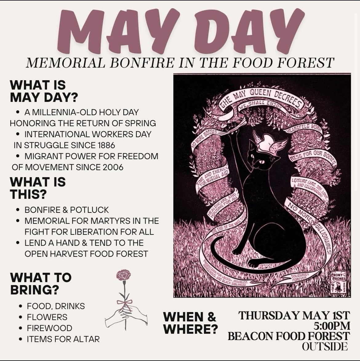 Event Uncategorized May Day Memorial Bonfire – Seattle by admin April 13, 2025 submitted anonymously – Join us for May Day 2025 🏴 🚩 🫶 Memorial for martyrs, bonfire, potluck, & chance to tend to the food forest 🙌 Bring items for altar, food, firewood 🤞 @ Beacon Food Forest fire pit 🤝 5 PM until late Post navigation Previous Post Previous Post Next Post Next Post