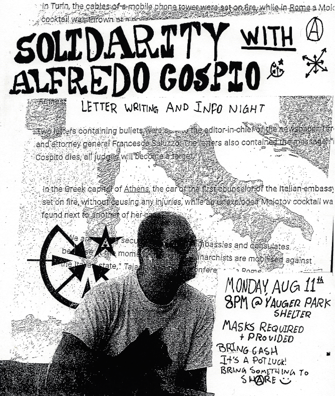 We are answering a call for international solidarity for anarchist prisoner Alfredo Cospito – come write letters and hear about him, his struggle against the brutal 41-bis prison regime, and the Informal Anarchist Federation. We are going to be reading some of his letters and statements and watching a short 30 minute documentary about him and his struggle against 41-bis.