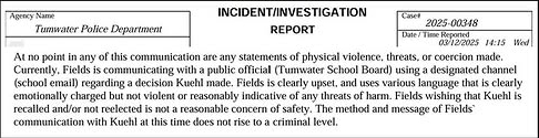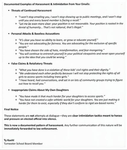 The TSD has also decided to target staff and community members who give the board comments. Ty Kuehl recently filed a police report against a local coach for “threats” and “harassment”. Read his ridiculous reasoning: