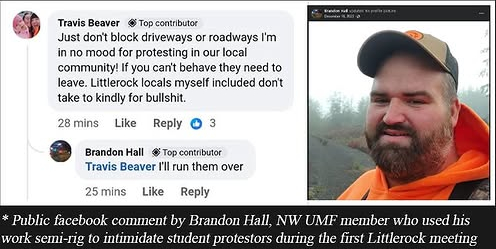 There is no doubt that the board is fully aware of the continuous presence of the armed NW UMF bigots at Littlerock board meetings, yet the board continues to hold meetings there in order to not have to face their constituents in their district office, which is accessible to the broader community.