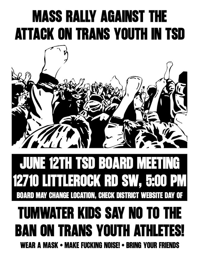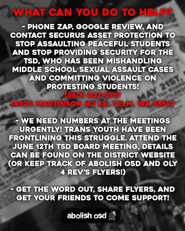 We need numbers at the meetings urgently! Trans youth have been frontlining this struggle. Attend the June 12th TSD board meeting, details can be found on the district website (Or keep track of Abolish OSD and Oly4Rev’s flyers)